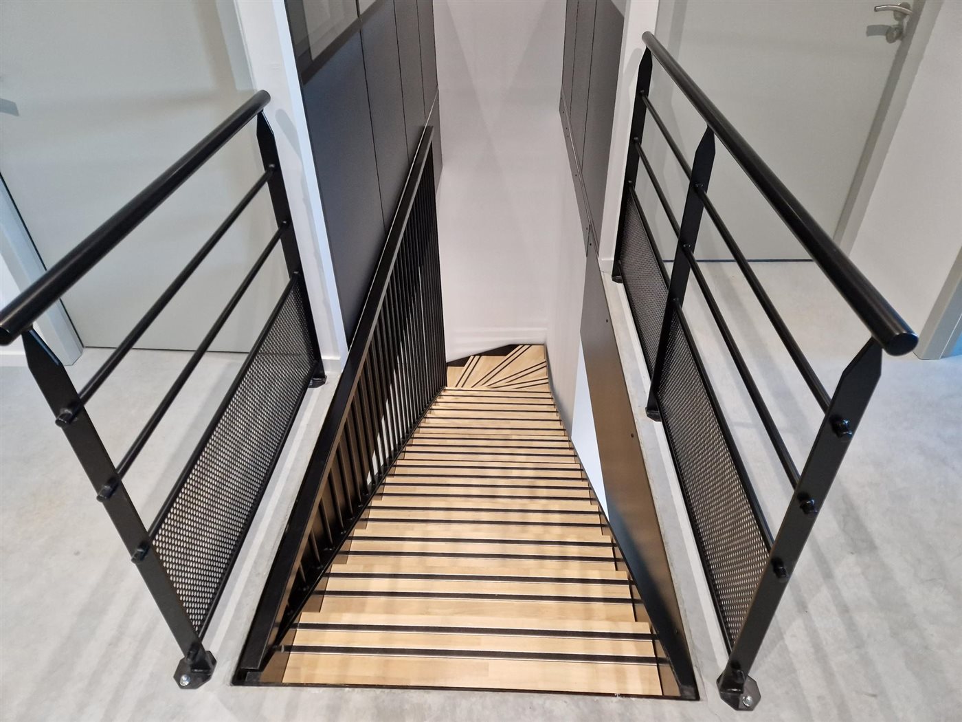 Le garde‑corps, composé de barreaux verticaux en acier, contribue à la légèreté visuelle de l’ensemble. Son design simple et graphique s’inscrit dans les tendances actuelles de l’aménagement intérieur. Les lignes verticales créent un rythme visuel élégant, tout en assurant une sécurité optimale.