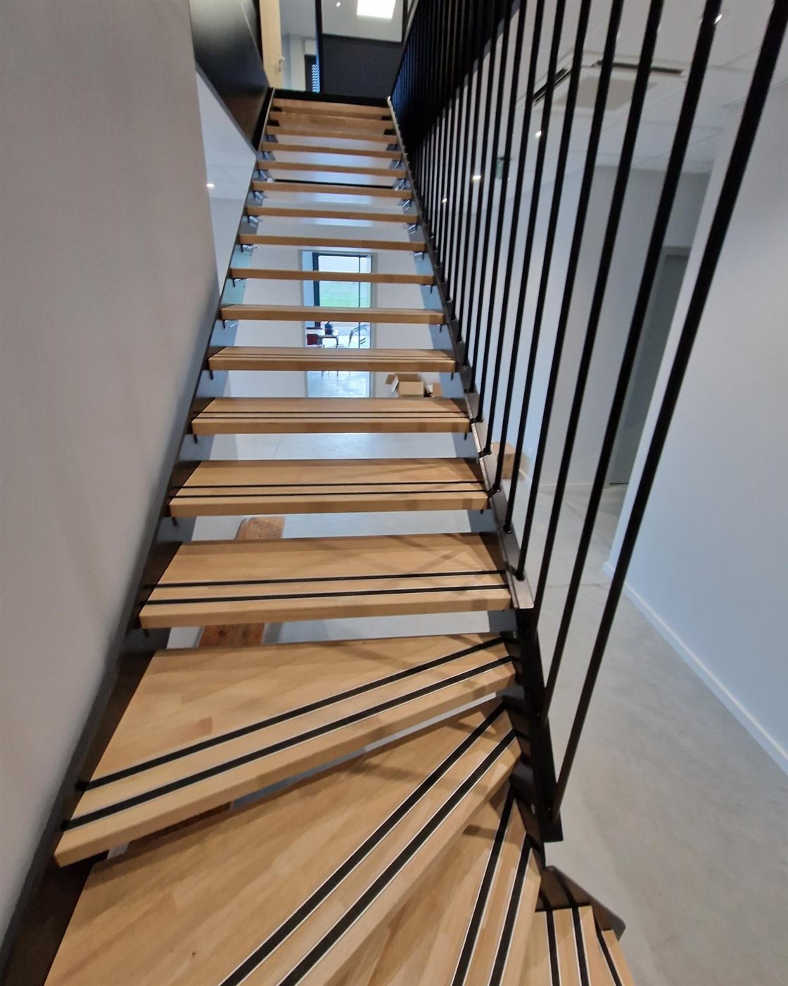 Pour contraster avec la structure métallique, les marches ont été réalisées en bois massif. Leur teinte naturelle apporte chaleur et confort visuel, créant un équilibre subtil entre modernité et authenticité. Chaque marche a été ajustée avec précision pour s’intégrer parfaitement dans la structure.